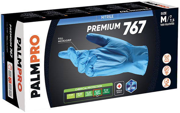 Guanti monouso in nitrile. III categoria di rischio tipo B. Colore azzurro. Ambidestri con bordino. Senza polvere. Finitura interna liscia ed esterna micro-ruvida su palmo e dita. Contro rischi chimici e microbiologici. Dispositivo medico. Non sterile. Lunghezza mm.240. Spessore mm.0,12, peso 5g. Contatto con tutti gli alimenti. AQL<1.5. Conf.100 pz. =50 paia.