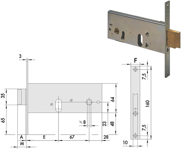 Serrature per fasce. Scrocco con catenaccio incorporato. Entrata 60: 1 mandata. Entrate 70/80/90: 2 mandate. Reversibile. Frontale zincato. Quadro maniglia mm.8. Predisposte per cilindro ovale. Contropiastra non compresa.