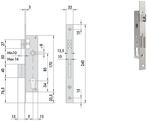 Serrature per montanti. 1 MANDATA. Catenaccio e scrocco reversibile. Scrocco regolabile da mm.10 a 16 per entrate 25-30-35; da mm.10 a 13 per entrata 21. Frontale zincato. Quadro maniglia passante mm.8. Predisposte per cilindro profilo europeo. Contropiastra non compresa. Sostituisce serie 44620.