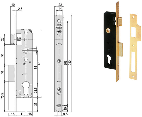 Serrature a cilindro per montanti. Per porte in legno. 1 mandata. Catenaccio e scrocco reversibile. Predisposte per cilindro profilo europeo. Scatola acciaio con rivestimento in zinco. Frontale e contropiastra in acciaio satinato ottonato.
